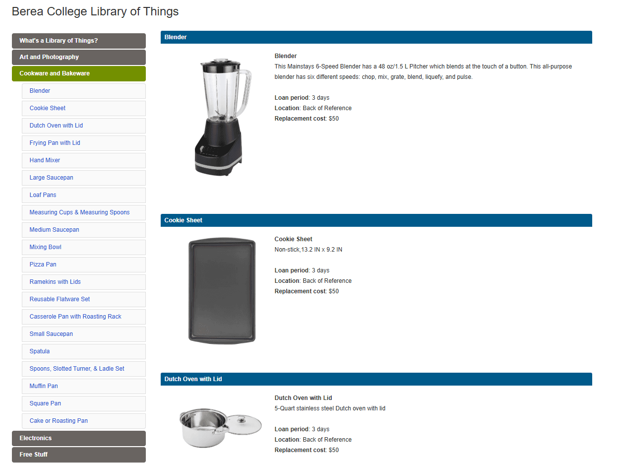 One key benefit of the Library of Things is lowering the barrier to entry for all kinds of fun, useful, and enriching activities. “If you want to bake a cake, you shouldn’t have to go buy a cake pan and mixing spoons and measuring cups and all that stuff,” said Amanda Peach. “If you’re only going to do it once or twice a semester, that’s silly.” The wide array of items that students can check out from the Library of Things enables them to try things they may not have had the chance to without this resource. “Our students want to do things, and they can’t afford them all. We know that about them,” said Amanda. “We help students who are of limited means, right?” The Library of Things is one more way that Berea gives its students access to experiences and opportunities that might otherwise be out of reach.