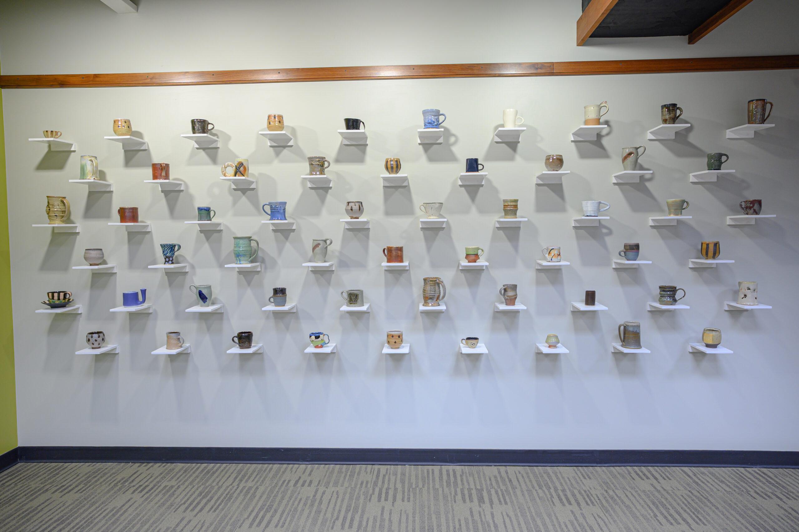 In partnership with Philip Wiggs, Berea’s Director of Ceramics, Amanda applied for a grant from the Work College Consortium in 2018 and established the Mug Library at Hutchins in 2019. It was an immediate sensation—out of 133 mugs on display, 78 were checked out in the first four hours of the installation’s inaugural open house.